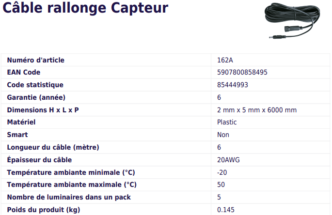 Un câble d’extansion de 6 mètres de long pour capteur de lumière. Compatible avec les transformateurs de 100 W et 150 W. Vous pouvez utiliser au maximum deux câbles rallonge de capteur à la suite.