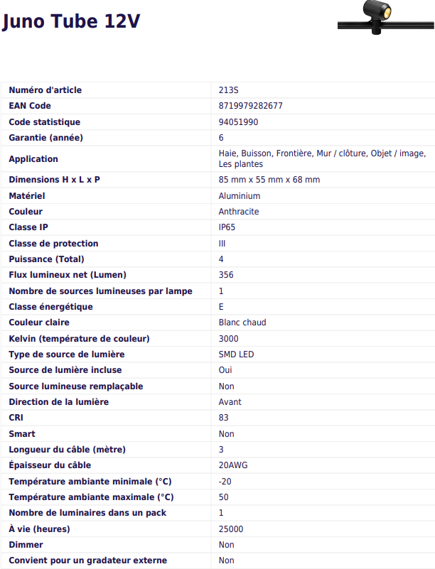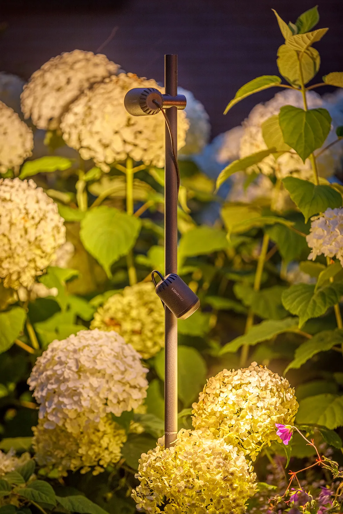 Sur cette barre, vous pouvez facilement fixer les spots correspondants pour ensuite les déployer de différentes manières. Vous pouvez choisir de fixer le piquet de terre à la barre et de positionner la Juno Tube entre vos plantes. De cette façon, les spots éclairent votre plantation par le haut ou bien vous pouvez les orienter plus efficacement vers des plantes plus hautes. Vous pouvez également fixer la barre avec les spots au mur. Par exemple, on peut fixer la Juno Tube à une clôture et diriger le spot sur les plantes qui se trouvent en dessous ou encore placer la barre sur l’auvent, ce qui permet de diriger les spots là où vous voulez créer plus d’ambiance.