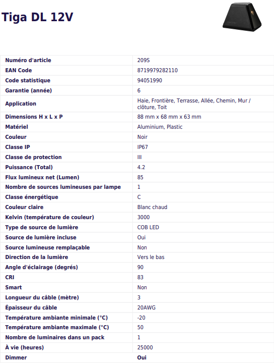 Il suffit de fixer la Tiga DL sur un mur, en orientant la source lumineuse vers le bas ou vers le haut, en se servant du support mural fourni. Vous êtes à la recherche d’un éclairage qui illumine le chemin mais sans lampe visible ? Dans ce cas, placez la Tiga DL dans le sol entre les haies avec le piquet fourni. Ce luminaire est également très esthétique dans les escaliers et accroît en plus la sécurité.