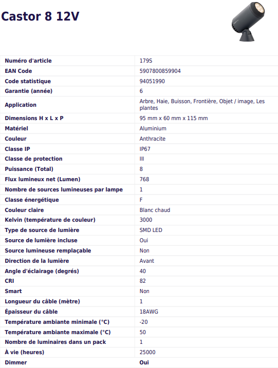 Le Castor 8 est unique dans ses fonctions. Il est composé d’aluminium avec un revêtement en poudre anthracite mat. Dimensions: 9,5 cm de haut et 14 cm de large. Le Castor 8 a un angle de lumière de 60 degrés et une consommation de 8W. Ce spot est idéal pour l’éclairage d’accentuation. Il met en valeur les éléments qui ont besoin d’être illuminés. Il vous apporte tout au long de l’année l’éclairage souhaité puisque c’est vous-même qui variez l’intensité.