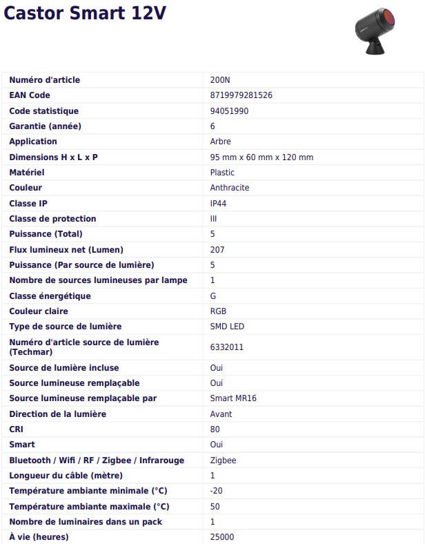 Castor Smart est doté d’une source lumineuse Zigbee. L’avantage de Zigbee est que la communication passe d’un produit à un autre, pour que vous ayez une portée illimitée. Vous pouvez maintenir une distance maximale de 20 mètres entre deux produits. Une fois que vous vous êtes procuré la passerelle (qui convertit le Wi-Fi en Zigbee) et que vous l’avez associée à l’appli, vous pouvez commander la lampe Castor Smart avec la nouvelle appli Lightpro. Illuminez vos bordures dans la couleur de votre choix avec Castor Smart. Une lumière bleue, rouge ou plutôt blanc chaud ? Grâce à la nouvelle application Lightpro, vous pouvez facilement définir la couleur de la lampe, sa luminosité ou l’heure à laquelle elle doit s’allumer ou s’éteindre. Le tout facilement contrôlé depuis votre smartphone.