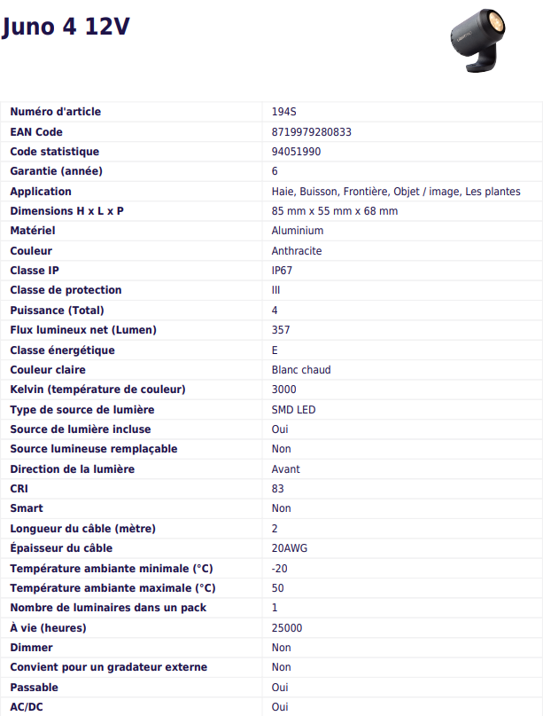 Vous avez certains objets dans votre jardin qui nécessitent un peu plus d’attention ? Alors, le Juno 4 est le moyen idéal pour les accentuer. Qu’il s’agisse d’un arbre, d’un arbuste ou d’un autre objet, ce spot garantit que personne ne peut le manquer. En raison de son apparence simple mais élégante, le Juno 4 s’adapte à tous les éclairages extérieurs. En éclairant différents objets, vous pouvez créer une atmosphère très agréable dans votre jardin en un rien de temps. En plus de l’atmosphère, ce spot a également un effet fonctionnel. Vous pouvez placer le Juno 4 sur le mur aussi facilement que dans le sol pour, par exemple, éclairer les plantes inférieures.