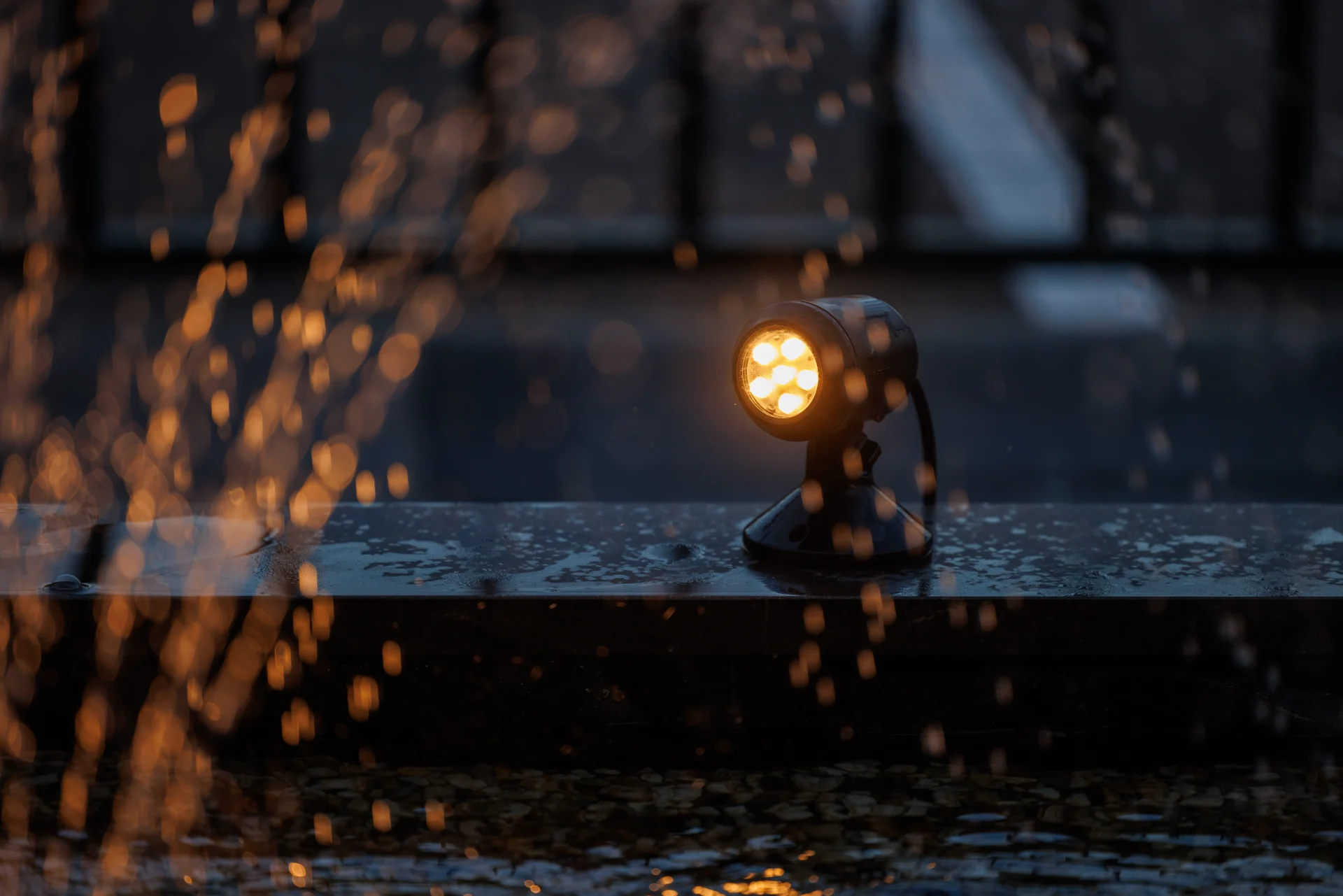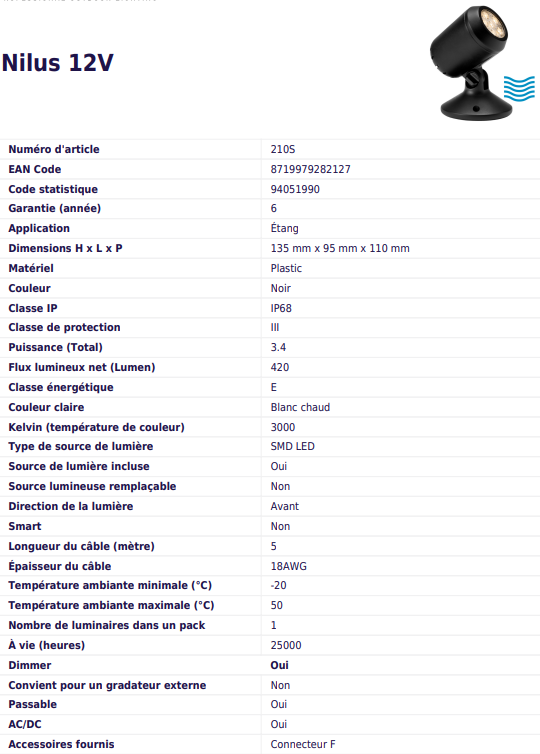 Le Nilus se tient solidement dans un étang grâce à sa base lestée, mais il est également facile à fixer sur une surface solide grâce aux vis et chevilles fournies qui s’adaptent précisément à la base. Le Nilus est équipé d’une source de lumière LED SMD qui donne une lumière blanche chaude. En bref, vous pouvez facilement, rapidement et en toute sécurité créer un spectacle immergé avec le Nilus.
